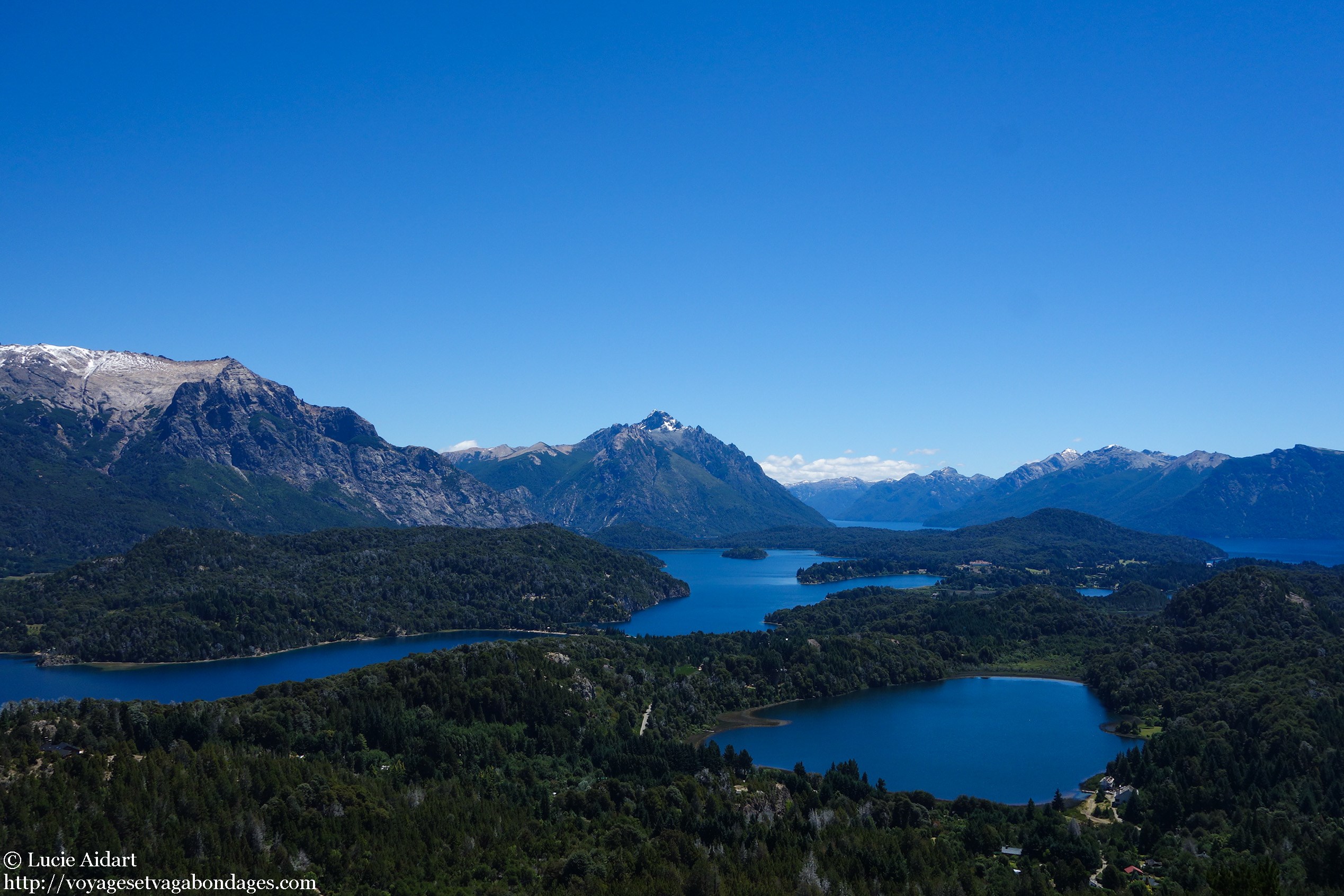 Le lendemain, il fallait compenser ce bon repas par un peu de sport et nous décidâmes donc de partir à l’assaut du Cerro Campanario, recommandé par l’Office du tourisme. Il y a un télésiège, mais nous étions bien sûr plus vaillantes que cela! Mal nous en a pris et j’ai maudit cent fois l’Office du tourisme qui m’avait parlé de cette marche comme une ballade facile de 20 minutes. Je ne crois pas avoir jamais fait de montée plus raide que cela et nous avons dû mettre une bonne heure pour atteindre le sommet en se faisant dépasser par de vaillantes familles argentines. La vue en haut en valait certes la peine. La vue à 360°C sur les lacs et les montagnes alentours étaient à couper le souffle et semblait irréelle, tout droit sortie d’une peinture. Le bleu du ciel, le bleu des lacs, la neige sur les sommets, la perspective et cette impression de montagnes sans fin est assez indéfinissable.