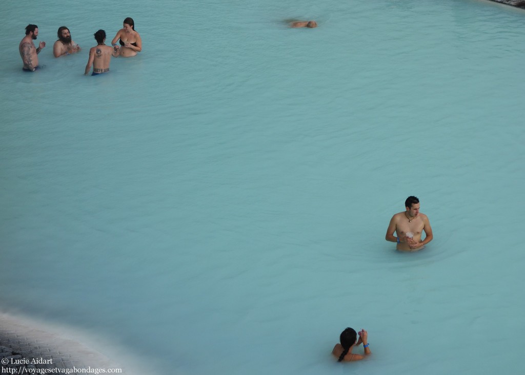 Il est temps ensuite de vous jeter à l’eau. Personnellement, je n’ai pas attendu trop longtemps pour y entrer en raison de la fraîche température extérieure. Il est très agréable de flotter paisiblement dans l’eau chaude turquoise et de se relaxer. L’expérience doit être magique sous la neige, mais ce jour-là, je ne rechignais pas à la vue des rayons de soleil dansant sur l’eau. Une fois dans le lagon, relaxez-vous et profitez, surtout s’il y a peu de monde. Vous pouvez également faire un tour au sauna ou à la cascade. Une cascade en béton très décevante qui n’a pas grand chose à voir avec les photos sur le site Internet. Il y a également un bar où vous trouverez rafraîchissements, masques et gommages. Se trouvent également dans le lagon plusieurs stations qui permettent de se faire soi-même un masque à la silice et d’avoir l’air ridicule pendant quelques minutes. Pour ma part, j’ai testé masque et gommage.