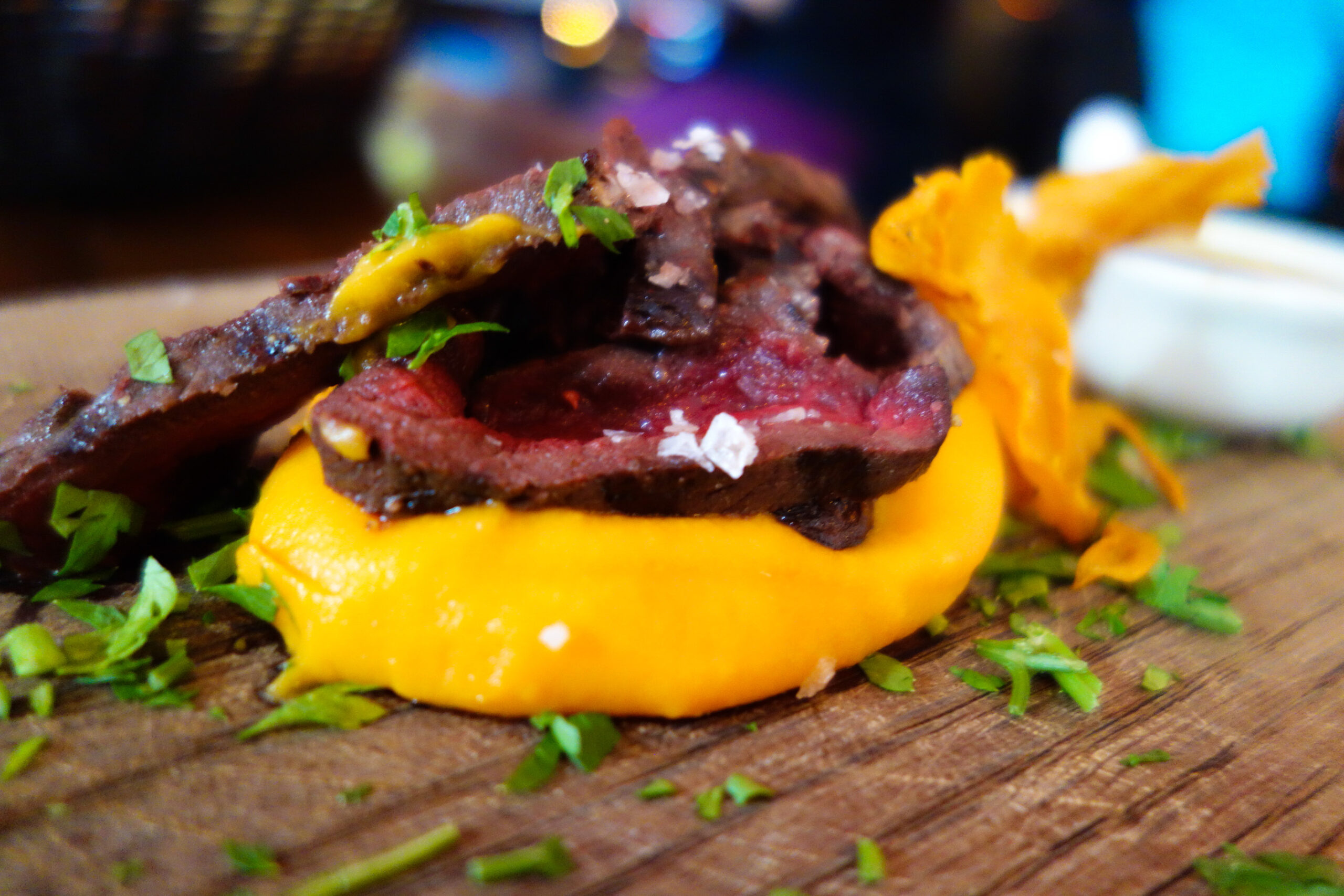 Je ne savais pas du tout à quoi m’attendre avec ce tapas et ce fût mon plat préféré de tout le repas. J’ai eu le droit à de nombreux morceaux de viande accompagnés d’une salade fraîche et de la fameuse sauce. Ce plat ne ressemble à rien de ce que j’ai pu goûter auparavant. Le macareux est une viande très tendre avec un goût de gibier très doux et très fin, le tout en parfait accord avec la salade et la sauce sucrée. Je n’en ai pas laissé une miette dans l’assiette et j’en aurais bien repris un petit peu!