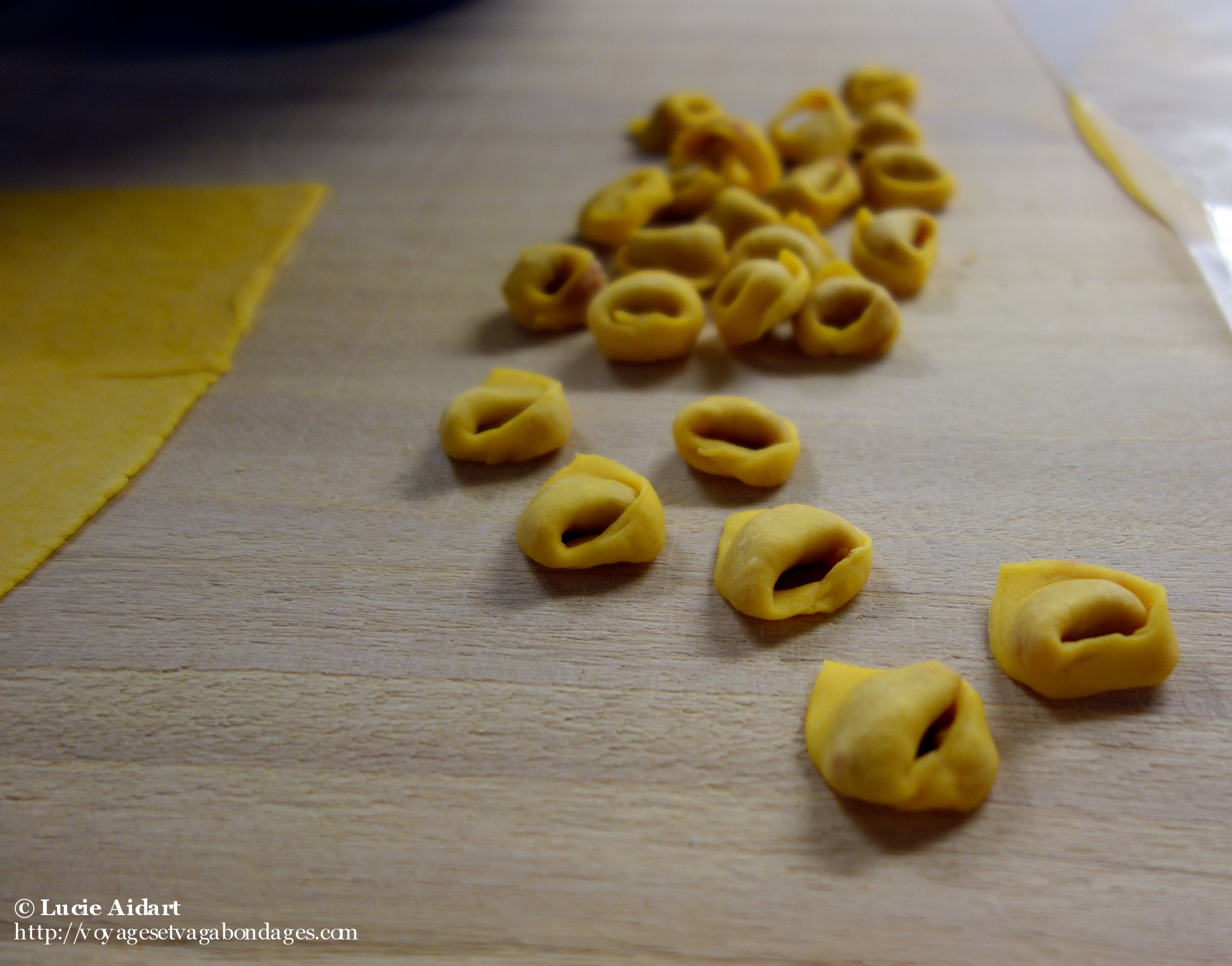 Nous passons ensuite aux Tortellini, à la forme similaire, mais plus petits et fourrés à la viande. J’ai pris la main et je m’en sors un tout petit peux mieux. L’après-midi se passe tranquillement en bavardages en français (mon italien est malheureusement bien plus que sommaire), seulement interrompus par les exclamations d’admiration des clients devant mon travail (mouais, faut pas me la faire…) et par celles de Daniela, qui me raconte son amour pour Bologne, pour l’Italie, pour la bonne nourriture et pour les pâtes. Elle répond à toutes mes questions et me parle aussi de la France. Une des choses apprises ce jour-là et qu’il faut faire bien attention, les spaghettis à la bolognaise ne sont en aucun une spécialité de la ville et si un restaurant tente de vous faire croire le contraire, il s’agit probablement d’une belle arnaque touristique. Chaque région a d’ailleurs sa spécialité de pâtes, que ce soit dans le remplissage des tortellinis ou dans la forme des pâtes. A Bologne, il faut donc manger des tagliatella al ragu.