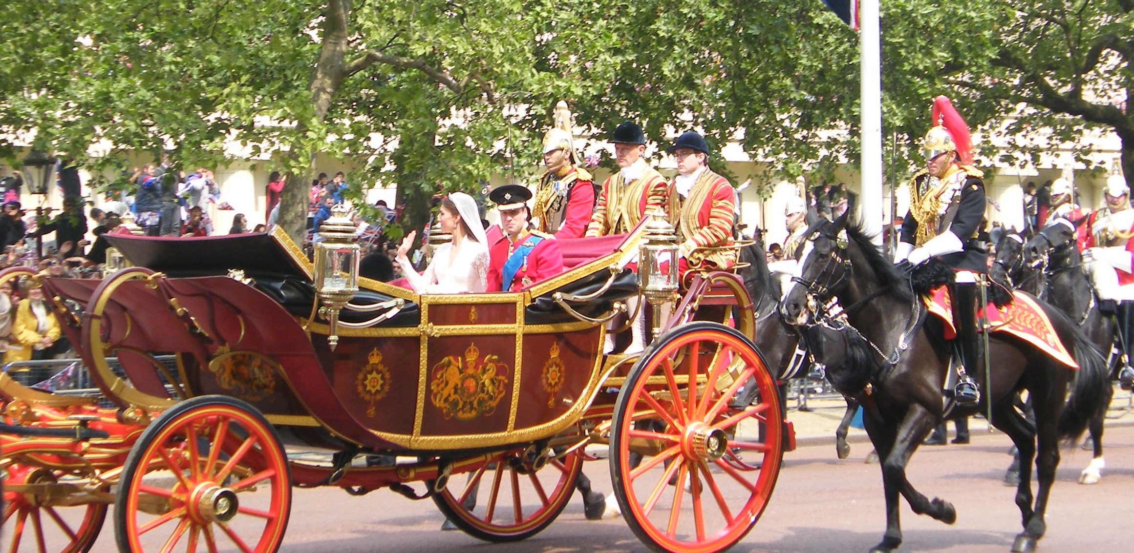L’attente est longue, il fait froid, et les campeurs autour de nous sont fort peu sympathiques et s’énervent parce qu’on leur bouffe leur espace vital et qu’ils doivent plier les tentes… Forcément on est de mauvaise humeur quand on campe plusieurs jours dehors en plein centre-ville sans rien à faire durant la journée. L’ambiance n’est pas à la fête étonnamment et l’on patiente comme on peut en papotant, bouquinant, en mangeant plusieurs petit-déjeuners, ou en observant les costumes excentriques et les bobbys qui viennent se poster tout le long des barrières. Vers 10h enfin, c’est l’effervescence: de la musique retentit, certains écoutent la radio pour suivre le mariage et des voitures défilent en direction de Westminster. Au deuxième rang, on aperçoit rapidement William, la mariée et quelques autres célébrités. Puis la cérémonie est retransmise par les haut-parleurs. Le mariage en soi était intéressant, mais sinon qu’est-ce que c’était long. Prières et blabla, on s’en serait bien passé, jusqu’à ce que l’hymne retentisse et que le cortège se dirige enfin vers Buckingham.