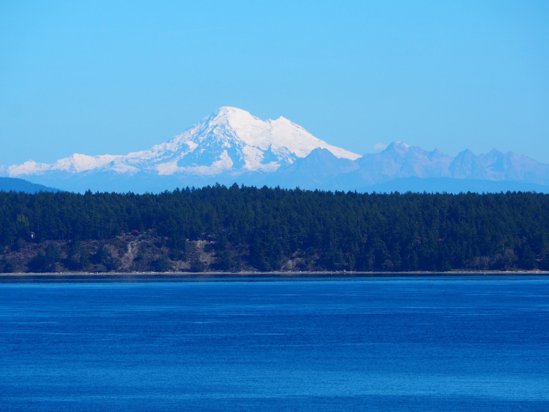 L’île est de la même taille, plus habitée, plus connue, plus touristique, plus fermière, moins sauvage, moins accidentée. Ses plages, ses vues sur les îles et le Mount Baker au loin, sur Victoria et l’île de Vancouver de l’autre côté nous accueille joyeusement. C’est un renard noir à la queue blanche qui lance le comité d’accueil. Notre mission est claire. Nous voulons voir des orques, qui semblent se laisser désirer dans tous nos voyages canadiens. A la plage des baleines, Lime Kiln Point State Park, nous attendons, comme beaucoup, avec livre et cookies le passage des élusifs orques. Nous manifestons, nous prions, nous feignons l’indifférence, nous chantons, nous appelons, les orques, les dauphins, les phoques et les baleines. En vain… il semble que la faune n’apparaît jamais sur demande, mais plutôt au coin du regard, quand jamais on ne les attends. Olivier se lance, appelle de ses mains, un cri du coeur vers un autre monde et il est… miraculeusement… entendu! Un souffle, une expiration, une baleine qui passe juste sous notre siège, à presque la toucher. C’est un spectacle que nous connaissons, mais qui ne nous est pas encore familier et d’usage. Le coeur bat, l’amour se défoule et se saisit de nous à plein coeur, devant de tels paysages, en de tels instants, les yeux et les oreilles savourant à l’unisson.