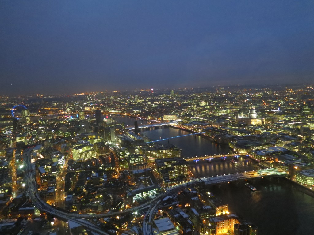 Je redescends bientôt, car il fait tout de même très froid, mais je suis alors bien décidée à attendre le coucher de soleil et la vue de nuit. Je continue donc d’admirer la vue. Je prends beaucoup de photos et je reste en contemplation pendant de longues minutes…. Trois heures passent ainsi et le soleil se couche peu à peu. Les lumières de la ville s’allument une à une et la vie nocturne commence. Au loin, j’aperçois les enseignes de Picadilly Circus. La BT Tower s’habille de violet, pendant que la City et Canary Wharf tentent de rivaliser avec Manhattan. La silhouette du Tower Bridge scintille. Le pont est vraiment de toute beauté de nuit. Tout près, des avions volent, atterrissent et décollent pour d’autres horizons, pendant que je retombe amoureuse de ma ville. Londres de nuit est hypnotisante, charmeuse et envoûtante. Chaque monument, chaque coin de rue me rappelle de bons souvenirs de ces deux dernières années et c’est à 244m au-dessus du sol que je revis avec bonheur mon histoire londonienne.