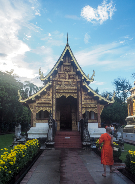 J’ai particulièrement aimé le Wat Phra Singh, même s’il y avait du monde. La pagode s’y mariait à merveille avec la lumière incroyable du coucher du soleil et le ciel bleu. J’ai aussi beaucoup aimé le Wat Chedi Luang et ses décorations lors du festival des lanternes, le Wat Chiang Man et son joli jardin et bien évidemment Wat Phratat Doi Suthep. Mais il y en a bien d’autres, et j’adorais les trouver au détour d’un chemin ou d’une ruelle et les visiter seule au petit matin ou au soleil couchant. Il y règne toujours une atmosphère paisible et apaisante. Parfois, des chiens y font la sieste. On y croise des chats, des oiseaux chanteurs, des moines, des touristes émerveillés et on s’y régale d’odeurs de fleurs et de plantes sauvages. Pénétrer dans un temple à Chiang Mai, c’est pénétrer dans un autre monde.