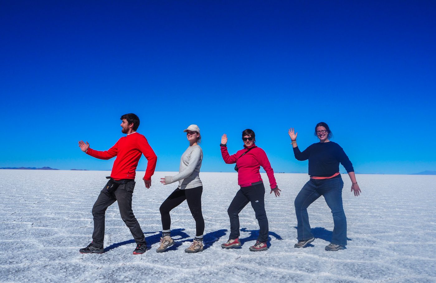 Petit-déjeuner et nous partons en exploration: le monument du Dakar, les drapeaux sont bofs. Nous voulons nous perdre dans ce désert de plus de 12 000 km2, nous voulons être seuls. Michael ne déçoit pas et nous trouve un spot loin de tout le monde (heureusement dans un tel espace!). Nous profitons de cette incroyable étendue, l’horizon blanc s’étalant à perte de vue. Où sommes-nous? Quel est donc ce lieu incroyable? Nous faisons les photos rigolotes et nous amusons comme des petits fous, même si nous sommes clairement mauvais dans cet art subtil!
